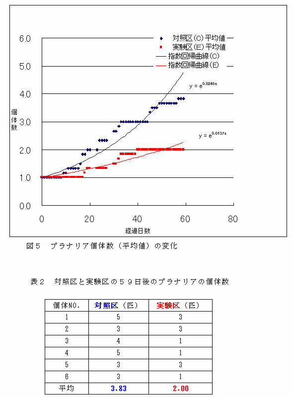 表1は各実験区の個体数変化を示したものである。対照区においては、順調に分裂が進み59日後の平均個体数は3.8匹、1回の分裂に要した平均日数は15.4日となった。この結果は、参考文献9)のプラナリアの分裂日数15.9日とよく一致した。実験区においては、59日後の平均個体数は2.0匹となり分裂に要した平均日数は29.5日となった。なお、1999.4.1〜1999.5.30の観察期間中の水温については、平均値20.1℃、最大値22.4℃、最小値18.6℃であった。また、1999.6.5〜1999.8.3の観察期間中の水温は、平均値21.0℃、最大値26.0℃、最小値15.0℃であった。