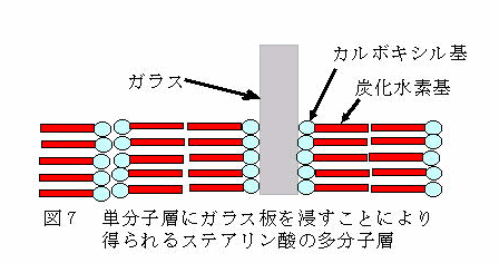 一般に、固体への吸着は温度、吸着する物質(この場合スチレンモノマー)の性質、吸着媒(この場合ガラス、ポリスチレン)の性質および状態などに関係し、物理吸着においては温度の増加は吸着量を大きく減少させる22)。また、次のLangmuirとBlodgettによって考案された実験(図7)によって炭化水素・ガラス間の吸着性と炭化水素・炭化水素間の吸着性を比較説明できる。ステアリン酸は疎水性の炭化水素基と親水性のカルボキシル基からなる高級脂肪酸である。水面のステアリン酸単層最密充てん膜にガラス板を通して浸して上げると、ステアリン酸分子はその極性をガラスの方に向けて付着してくる。このガラス板を再び押し込むと、水の表面に出ている炭化水素鎖がガラス板状の炭化水素とくっつくようになる22)。これは、炭化水素・ガラス間の吸着性よりも炭化水素・炭化水素間の吸着性の方が高いことを示している。したがって、炭化水素であるスチレンモノマーとポリスチレンとの吸着性はガラスよりも高いといえる。