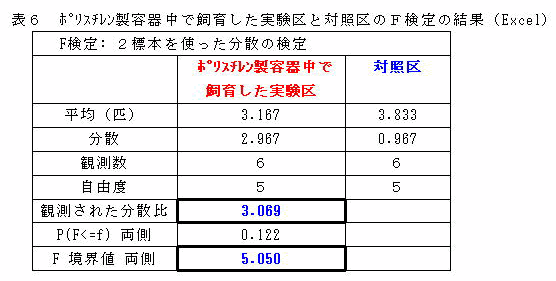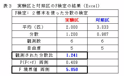 として、ExcelでF検定をおこなった。表6はその結果である。