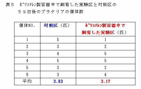 ポリスチレン製容器として用いたカップラーメン容器には、油分の影響を取り除くためノンフライ麺の製品を使用した。また、冷却後、20℃で保管時、使用時に水の状態を十分に観察していたが油分の存在は認められなかった。しかも、実験区とポリスチレン製容器中で飼育した実験区では同じ水(実験水)を使用していた。しかし、対照区とポリスチレン製容器中で飼育した実験区のプラナリアの分裂頻度には差が生じなかった。したがって、油分が実験水に溶出しているため分裂頻度に差が生じたとはいえない。