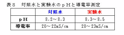 表8は、実験水と対照水のpH測定、導電率測定の結果である。pH測定値、導電率測定値の比較から、塩分等のイオン性物質の特異な溶出は認められなかった。使用したpHメーターはtwinpH B-212(堀場製作所)、使用した導電率計はTwin Cond B-173(堀場製作所)である。
