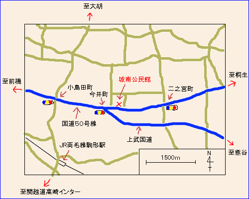 場所は、前橋市東部で、国道50号線から国道17号線のバイパス(上武国道)が分岐する交差点の付近です。