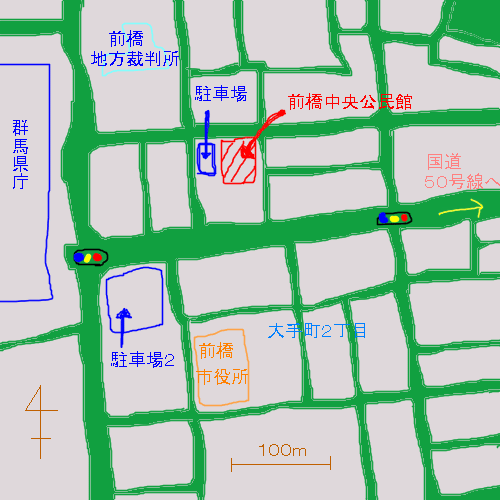 前橋中央公民館は、群馬県庁の正面の道(国道50号線の起点の道)の、県庁から東へ150m程の所にあります。